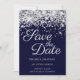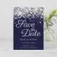 Crie seu casamento moderno, salve as datas. Borda superior brilhante prateada esparsa sobre um fundo azul marinho escuro sólido. Toda a textura brilhante, faísca, metálica e brilhante é criada por uma imagem gráfica digital impressa. O estilo e a cor da fonte podem ser personalizados.