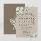 Este belo cartão de encontro vai avisar seus amigos e família sobre seu próximo casamento. Apresenta um elegante design de bolos com um calendário personalizável do mês do seu casamento, com um coração à volta do dia especial, rodeado por folhas de eucalipto e verde sobre um fundo castanho-claro ou esticado. Há espaço para seus nomes, a data do casamento e a localização. A parte de trás apresenta um buquê de folhagem rústico, amarrado com uma fita branca e um arco.