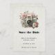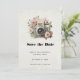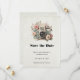 Save the date card with a vintage styled camera decorated with flowers. Pastel colors of pink, cream and green.