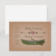 Um casamento salvou a data com a ilustração de um coração entre duas setas sobre a ilustração de uma canoa verde. Personalize o texto.