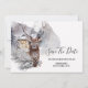 Uma maravilhosa ilustração aquática de uma cabana logarítmica em uma paisagem florestal cheia de montanhas com capas de neve e a majestosa cabeça de um stag com belos galhos emoldurados por um galho de árvore de abetos e cones de pinheiros. Estes são ideais para o país rústico; a floresta de inverno e os anúncios de "salvar a data". Essas cartas chatas luxuosas e elegantes vão deliciar seus convidados.