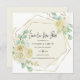 Uma maneira elegante de deixar amigos e familiares saberem que você remarcou seu casamento. Um quadro geográfico dourado envolve os detalhes da data do casamento. O fundo branco de marfim destaca o texto. Salve nossa nova data é escrita em um script moderno, com detalhes a seguir. As rosas brancas muito bonito aninhadas em folhas verdes de sábio decoram a estrutura geométrica de ouro. O plano de fundo do novo cartão de data é bege.