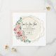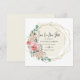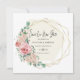 Uma maneira elegante de deixar amigos e familiares saberem que você remarcou seu casamento. Um quadro geográfico dourado envolve os detalhes da data do casamento. O fundo bege suave destaca o texto. Salve nossa nova data é escrita em um script moderno, com detalhes a seguir. As rosas cor-de-rosa e as flores de hydrangea são aninhadas em folhas de folhagem verde que decoram a estrutura geométrica de ouro. O novo cartão de data é bege.