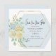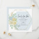 Uma maneira elegante de deixar amigos e familiares saberem que você remarcou seu casamento. Um quadro geográfico dourado envolve os detalhes da data do casamento. O fundo azul suave destaca o texto. Salve nossa nova data é escrita em um script moderno, com detalhes a seguir. Rosas brancas muito bonito e híbridos azuis aninhados em folhas verdes seniores decoram a armação geométrica de ouro. O plano de fundo do novo cartão de data é azul claro.