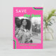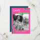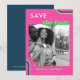 Surpreenda seus convidados com estes vibrantes e elegantes cartões de Save the Date rosa e azul claro com fundos rosa e azul claro, escrita groovy, sua foto e texto personalizados. Adicione facilmente seus detalhes clicando na opção "personalizar".