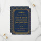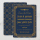 Estes cartões de salvar a data apresentam uma paleta de cores azul e dourado, uma moldura geométrica, padrões geométricos e outros detalhes estilísticos inspirados no Art Déco e nos loucos anos vinte. Você pode personalizar os campos de texto de exemplo ao seu gosto.