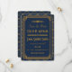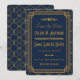 Esses save the dates apresentam uma paleta de cores azul e dourada, uma moldura geométrica, padrões geométricos e outros detalhes estilísticos, todos inspirados no Art Deco e nos loucos anos vinte. Você pode personalizar os campos de texto de exemplo ao seu gosto.