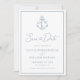 Este elegante casamento náutico minimalista salvo o cartão de data apresenta um monograma âncora no topo com as iniciais da noiva e do noivo, com um simples fundo branco e texto azul empoeirado, e um modelo fotográfico no verso.