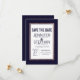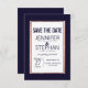 Frente moderna, simples e elegante esboço de pinstripe rosa em ouro em azul e branco marinho, cartão de casamento "Salvar a Data". Este design clássico e sofisticado é perfeito para o casal de competição de tendências e na moda. Personalize com sua própria mensagem na frente, assim como um monograma personalizado inicial no verso. Todas as impressão de fotos.