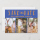 Wedding Save the Date confetti cartão com fotos com script de escrita manual cursivo e esquema de cores de tendência personalizável para as suas especificações de evento. A imagem de exemplo foi usada com permissão.