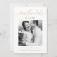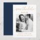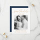 Este simples Casamento Salve a Data apresenta uma bela caligrafia dourada e uma foto na frente com um azul escuro sólido de volta.