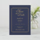 Um convite de casamento em azul marinho e dourado inspirado no art déco com tipografia elegante. Criado por Thisisnotme©
