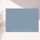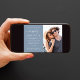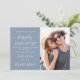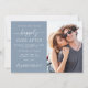 Anúncio de casamento azul poeirento moderno com data para salvar apresentando sua foto e "Felizes para Sempre" em uma mistura de tipografia branca simples e um script branco chique. Personalize os detalhes da data para salvar e adicione seus nomes em um script semelhante a uma assinatura. No verso, seus nomes e data do casamento são unidos por um coração.