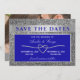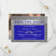 Moderno, simples roteiro de caligrafia, elegante convite de casamento azul real e brilho de prata Salve A Data com duas datas e foto do casal.