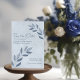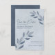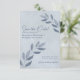 Estes elegantes cartões salve a data de casamento apresentam um design rústico, mas moderno, com ranhuras de folhas coloridas de cinza azul pintadas à mão, entrando de ambos os lados do cartão num fundo azul empoeirado e empoeirado. A tipografia é única e elegante, com textos justificados tanto à esquerda como à direita. Simples e na moda, estas cartas são a maneira perfeita de deixar seus amigos e família saberem sobre seu próximo casamento.