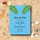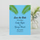 Este convite de salvar a data de casamento na praia é perfeito para um casamento moderno de verão à beira-mar. O design romântico apresenta folhas de palmeira verdes com tipografia preta elegante em um fundo azul-turquesa.