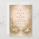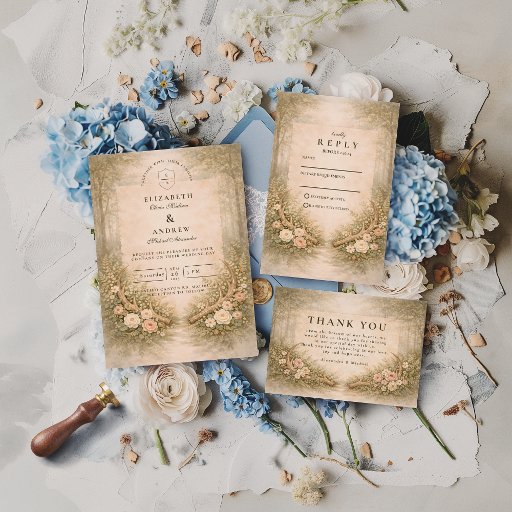 Um design romântico inspirado na floresta, apresentando flores neutras suaves, galhadas elegantes e um fundo de pergaminho vintage quente. A composição combina folhagem orgânica com detalhes refinados para uma estética boho atemporal que se sente íntima, natural e silenciosamente luxuosa—perfeita para casais que se sentem atraídos pelo romance clássico com um toque rústico e voltado para a natureza.