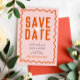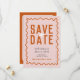 Este ousado casamento cor-de-rosa 'salve a data' abraça um tema dos anos 70. A parte frontal apresenta uma borda laranja com letras retrorreflectoras, e a parte traseira tem espaço para você adicionar uma foto, com uma borda retrorreflectora correspondente. Este simples design é perfeito para casais que amam o encanto da vintagem com uma reviravolta moderna. Ideal para casamentos de verão, inspirados no retrô. Explore itens correspondentes na nossa suíte de casamento para completar a aparência!
