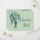 Nuptura Botânica de Linda Sage Green Willow Branch Salve a Data | Esta é uma design de casamento botânica ao estilo minimalista bonito que apresenta uma ramificação verde-azul de salgueiro sobre um fundo verde sábio com as palavras Salvar nossa data em roteiro manuscrito na frente. As costas têm a design invertida e os nomes do casal feliz com a data do casamento e um lugar para uma pequena nota embaixo em fontes contrastantes. Todos os campos de texto são modelos para que você possa personalizá-los facilmente. #savethedate #lembrete