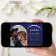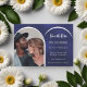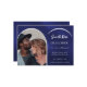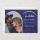 Uma foto Salve o cartão de data do seu casamento Na frente: adicione sua própria foto vertical. Fotografia do arco dourado. Um fundo azul marinho, texto branco. A cor azul é irregular. Personalize e adicione seus nomes e a data.