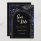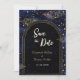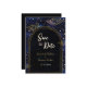 Anuncie seu dia especial com este elegante celestial místico Salve o cartão Data. Com um fundo preto rico, adornado com estrelas de ouro falso e cintilantes, e constelações, este design irradia um senso de romance cósmico e elegância eterno. O refinado layout e os detalhes celestes criam uma atmosfera sonhadora, perfeita para almas assombrosas e noites encantadas. Uma maneira cativante de marcar o início de sua história de amor escrita nas estrelas.