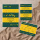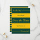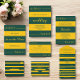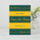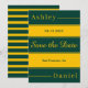 Este elegante casamento verde e dourado que salvou a data é perfeito para um casamento moderno. o design de luxo apresenta uma elegante caligrafia verde e dourada num fundo verde e listrado de ouro.