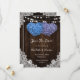 Casamento romântico roxo e azul salva os cartões de data com corações hydrangea contra um fundo de madeira de celeiro adornado com rendas florais brancas e luzes de cordas. Itens correspondentes disponíveis.