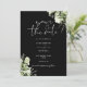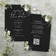 Este convite de save-the-date floral de greenery botânica preta e branca pode ser personalizado com suas informações em tipografia elegante com o código QR do site do seu casamento e detalhes no verso. Projetado por Thisisnotme©