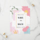 O design apresenta um fundo abstrato, vibrante e colorido, que faz uma declaração e dá o tom para uma comemoração viva e alegre. Perfeito para casais que querem adicionar um pouco de diversão e modernidade às suas festividades de casamento. O texto está em fontes limpas e elegantes, o que contrasta bem com o fundo lúdico, fazer o convite fácil de ler enquanto ainda é atraente visualmente.