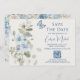 Casamento do Código QR Floral Romântico Azul Dusty Salva O Cartão de Data contém celeste azul empoeirado e flores delfinium com verde eucalipto acentuado com borboletas. Adicione seu texto personalizado em um roteiro elegante de caligrafia moderna, com seu site de casamento e seu código QR. Projetado para você pelo Evco Studio www.zazzle.com/store/evcostudio