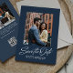 Este convite de "salve a data" elegante apresenta uma escrita inspirada no estilo retrô "salve a data" sob uma única foto em um fundo azul-navy clássico, juntamente com um texto personalizado simples. O verso deste convite de "salve a data" moderno tem uma faixa azul correspondente, juntamente com uma foto horizontal, espaço para uma mensagem personalizada e um código QR para o site do seu casamento. Este design vertical é ótimo para um casal moderno e elegante e é uma ótima maneira para o casal comprometido compartilhar informações do casamento com amigos e familiares. Encontre mais cores e estilos na coleção de Lea Delaveris Design. Também disponível como download digital de convite de "salve a data".