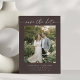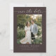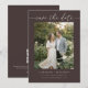 Este cartão de salvar a data apresenta uma foto de noivado emoldurada por um elegante texto manuscrito sobre um rico fundo marrom moca. O layout limpo e moderno destaca sua foto, mantendo o anúncio atemporal e romântico. O verso inclui um código QR para que os convidados possam facilmente visitar o site do seu casamento para obter detalhes e informações sobre a celebração. Personalize os nomes, data e local para compartilhar seus planos de casamento com amigos e familiares.