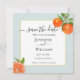 Elegante cartão de aviso de casamento com ilustração de laranja em aquarela em uma borda aqua pálida. Perfeito para casamentos de verão.