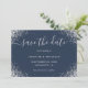 Casamento elegante de azul e prata de marinho salve o cartão de data apresentando uma fonte moderna em um fundo azul marinho adornado com cantos cintilantes prateados. Itens correspondentes disponíveis.