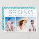 Celebre o seu amor com o nosso casamento da Photo Beach 2 Photo Beach Salve o Encontro. A frente mostra uma divertida design fotográfica com a mensagem divertida 'Bebidas grátis e uma felicidade para sempre.' No verso, encontre seus detalhes de casamento enquadrados por uma vibrante fronteira azulejo espanhola, acrescentando um toque de diversão e brilho. Perfeito por convidar seus hóspedes para se juntarem a você para uma alegre celebração de casamento na praia!