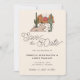 Convite de casamento boho personalizado com ilustração moderna da paisagem do deserto com pôr do sol e cacto, fonte de roteiro moderno para Salve a Data e modelo de texto totalmente personalizável para os nomes do casal e as informações do casamento. Lindo padrão desértico correspondente no verso em um fundo de terracota marrom quente.