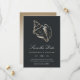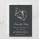 Avise os convidados do seu próximo destino, praia ou casamento na ilha tropical com estas belas cartões salve a data de verão com uma ilustração falsa de concha de folha de ouro em um fundo preto suave e rico. O roteiro branco elegante e a inscrição em bloco exibem os detalhes do seu casamento (nomes, data do casamento, local e site).