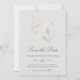 Avise os convidados do seu próximo destino, praia ou casamento na ilha tropical com estas belas cartões salve a data de verão com uma ilustração falsa de concha de folha de ouro em um fundo de cinza pálida macia. O roteiro de cinzas escuras e a inscrição em bloco exibem seus detalhes de casamento (nomes, data de casamento, local e site).