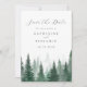 Personalize facilmente seu casamento, salve os cartões de data com este modelo editável. Possui design de tipografia elegante mínima com fundo de árvores de floresta aquáticas.