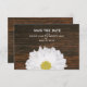 Um casamento salve o cartão de data com a imagem de uma margarida a espreitar do fundo sobre um fundo de madeira marrom escura. Personalize o texto com detalhes da sua ocasião.