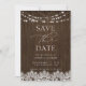 A moderna rusticidade salva a data com textura falsa de madeira de casca, e a caligrafia moderna escrita à mão, num design elegante e simples, com luzes brilhantes e rendas. Copyright Anastasia Surridge Designs, todos os direitos reservados.