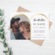 Uma foto Salve o cartão de data do seu casamento Na frente: adicione sua própria foto vertical. Fotografia do arco dourado. Um fundo branco, texto preto. Personalize e adicione seus nomes e a data.