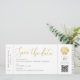 Seashell em folha de ouro falso em um estilo moderno e minimalista de passagem de embarque em avião, salve o cartão para um casamento na praia ou recepção do tema oceânico, com gerador de código qr personalizado, e toneladas de espaço para informações de viagem de convidado e detalhes de alojamento e sua foto no verso. É importante enviar informações de viagem cedo para casamentos de destino para que seus convidados tenham tempo para planejar a viagem. Esta passagem aérea salva a data é perfeita para um casamento formal chic ou casual no lado do oceano com um esquema de cor de ouro, e a impressão parece muito com folha de papel real mesmo sendo impressa em tinta regular, fazer mais barato especialmente para casamentos menores e micro. Clique em 'personalizar mais' para editar qualquer parte do design e torná-lo seu próprio, ou consulte o Compro Zazzle Destinos de Fita de Papel para MUITOS cartões salve a data de viagem e praia.