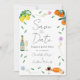 Um belo casamento colorido e colorido de água salva o convite de data com simples botânica, laranja e limão, tema ideal para um solarenga casamento no verão. A obra de arte original da artista Catherine Sweetman inclui folhagem, flores silvestres, queijo e vinho, notas musicais e flautas de espuma. Manuscrito Whimsical e roteiro tipográfico moderno com fácil personalização de modelos para acrescentar nomes, data e outras informações essenciais, juntamente com as iniciais da noiva e do noivo na ilustração do rótulo da garrafa de vinho espumante. A paleta de cores inclui limão, amarelo, laranja, verde, azul, roxo e rosa.