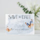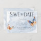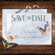 Capturar o charme da natureza com o casamento encantador da borboleta, salve o cartão. As borboletas de aquarela pintadas à mão dão vida a uma exibição cativante de cores ricas. Bonitos tons de bege, marrom quente, ferrugem de terracota, azul lacrimogêneo e creme criam um senso de elegância aconchegante. Uma lavagem de aquarela azul suave e empoeirada fornece o cenário perfeito. Esta design encarna perfeitamente a essência da natureza, convidando seus convidados a celebrar sua história de amor em meio a sua beleza. Criado pela imprensa simplesmente de farmácia.