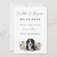 Casamento guarde os cartões de encontro com o desenho de cão Bernese Mountain. Texto azul-cinza, em script manuscrito e fontes impressas, com data em negrito. Papel branco minimalista com imagem de cão e flores silvestres no fundo. O reverso é cinza sólida azul.