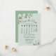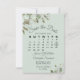 Este belo cartão de encontro vai avisar seus amigos e família sobre seu próximo casamento. Apresenta um elegante design bócio com um calendário personalizável do mês do seu casamento com um coração à volta do dia especial, rodeado por folhas de eucalipto e verde numa casa verde de menta. Há espaço para seus nomes, a data do casamento e a localização. A parte de trás apresenta um buquê de folhagem rústico, amarrado com uma fita branca e um arco.