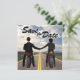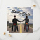 Este único convite para salvar a data apresenta uma bela paisagem de estrada e campos com um casal de menino e menina em motocicletas de mãos dadas. O casal tem cabelo castanho. Outras opções de cor de cabelo estão disponíveis mediante solicitação! Perfeito para um casal de bicicleta! Personalize facilmente esta opção Salvar a Data com todos os detalhes do seu casamento.