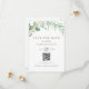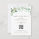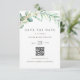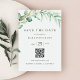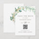Este moderno cartão de salvamento combina verde romântico com um layout minimalista e um código QR personalizado. Os convidados podem examinar facilmente o código para acessar o site de casamento ou os detalhes de RSVP. Uma mistura perfeita de natureza e conveniência, ideal para casamentos elegantes, jardineiros ou ao ar livre.