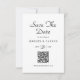Elevem seu planejamento de casamento com nosso Código de Código QR de Script Moderno Trendy Salve o Cartão de Data! Apresentando uma elegante caligrafia de script para 'Salvar a data' no topo, este design minimalista combina o texto preto do eterno em um fundo branco limpo com um código QR personalizável para RSVP sem problemas e acesso ao site de casamento. Perfeito para casais modernos, inclui campos editáveis para nomes, datas e um espaço QR para simplificar a comunicação de convidado. Ideal para placas impressas ou downloads digitais, este design elegante e experiente em tecnologia combina elegância clássica com conveniência moderna.